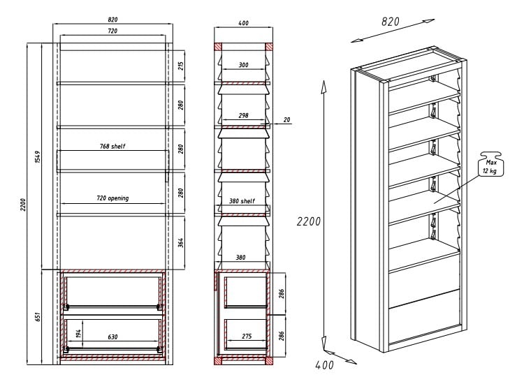 Dolna część regału wyposażona jest w dwie pojemne szuflady z systemem Tip-on, które otwierają się po lekkim naciśnięciu. Brak uchwytów podkreśla minimalistyczny wygląd i przyczynia się do czystego, nowoczesnego designu.