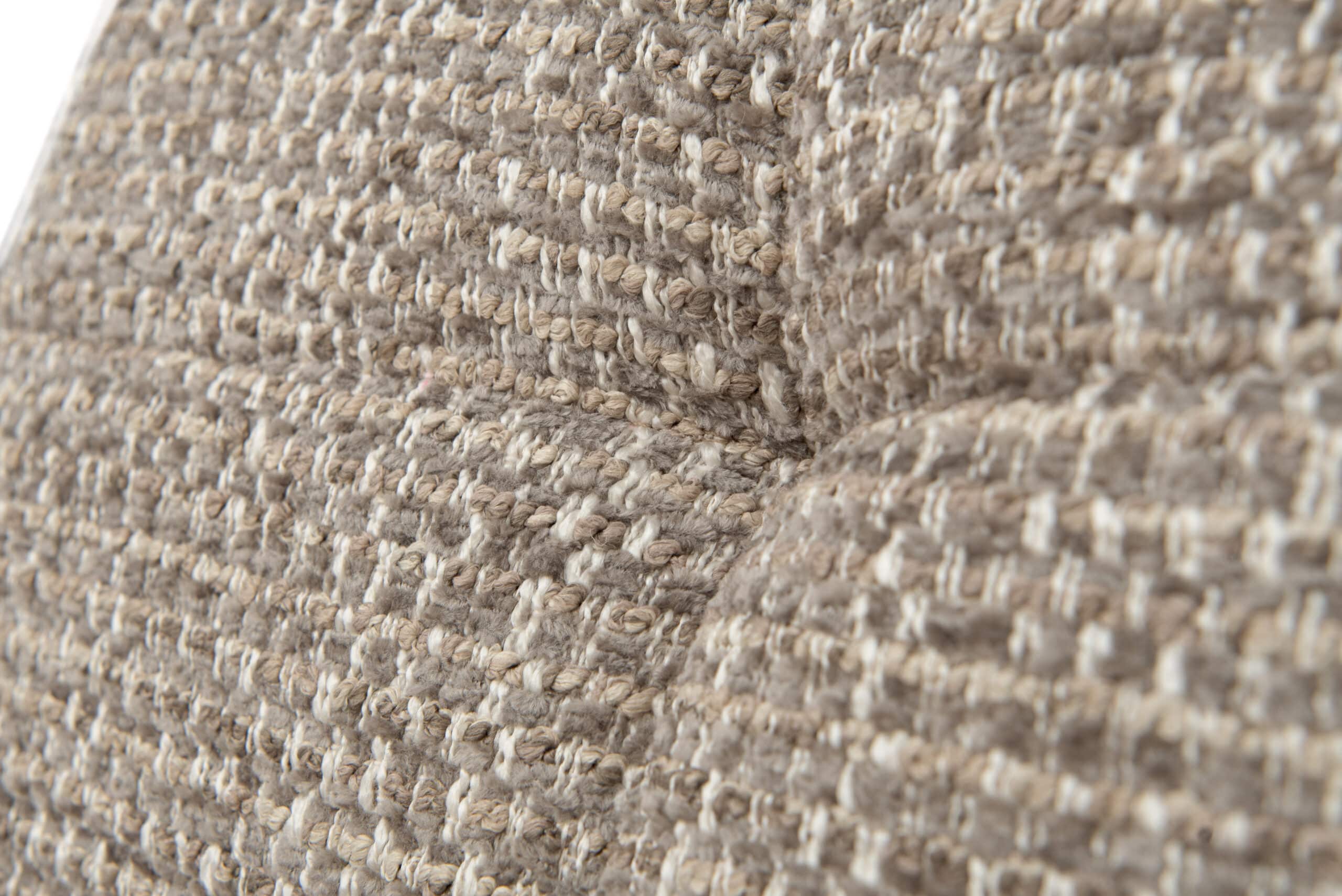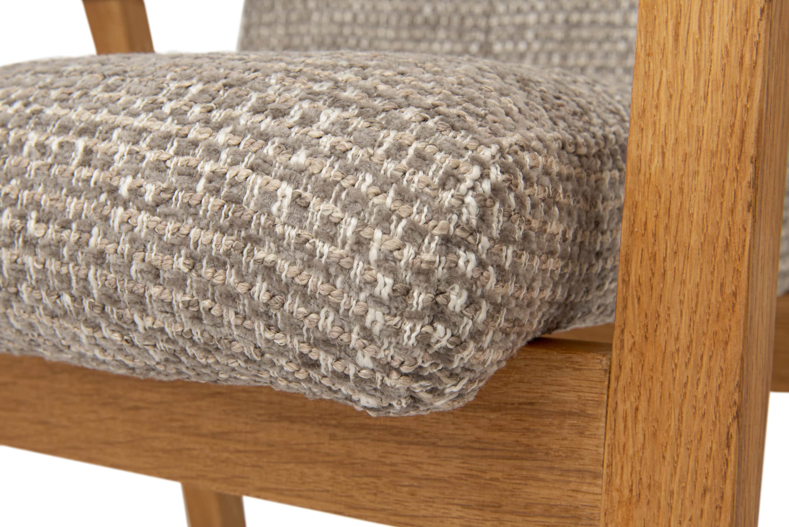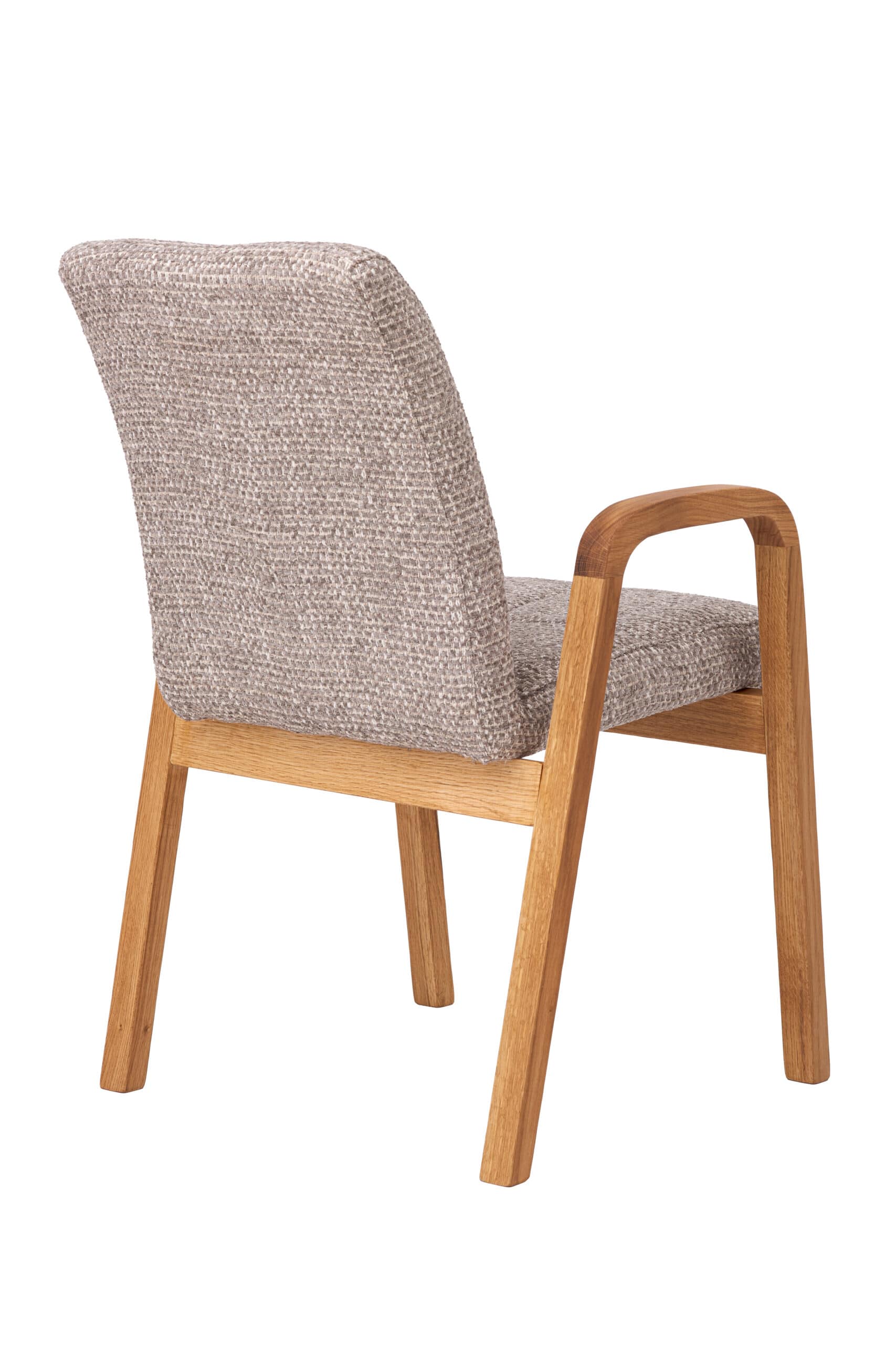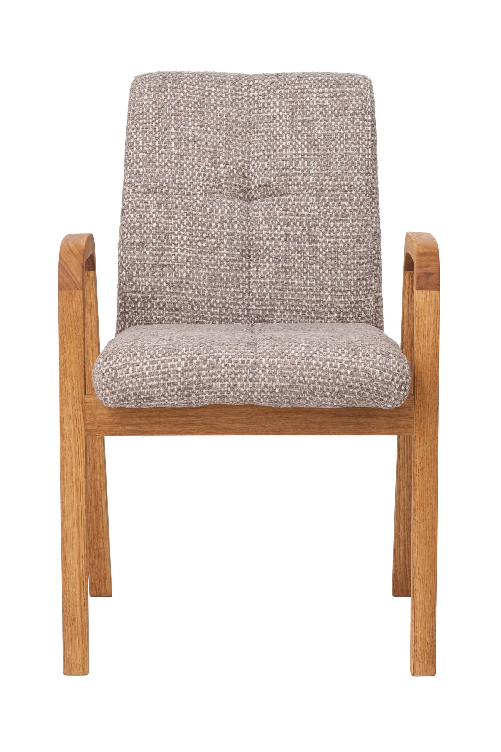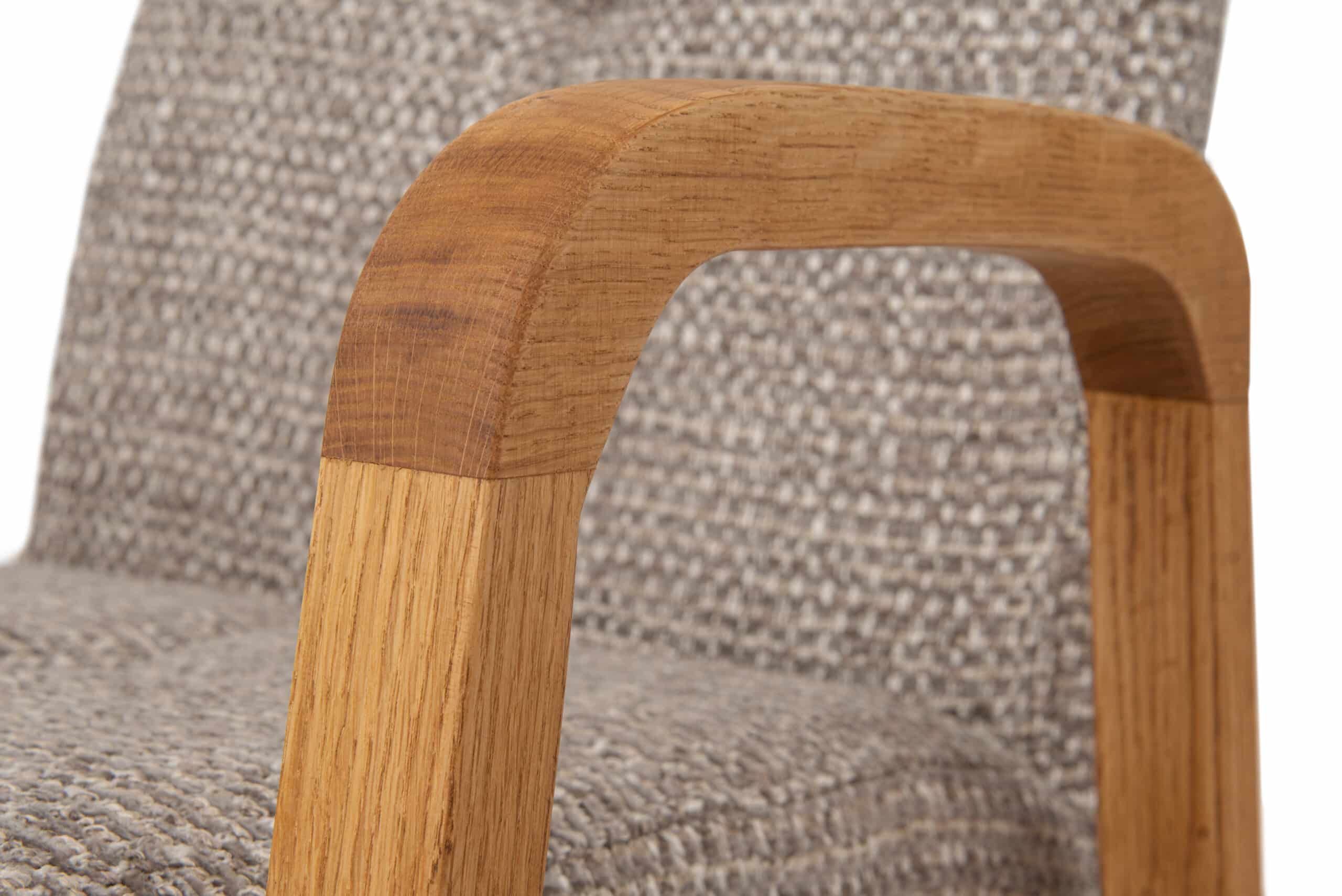 Siedzisko i oparcie są tapicerowane wysokiej jakości brązową tkaniną o wyraźnej strukturze. Materiał jest przyjemny w dotyku, miękki, a jednocześnie wystarczająco wytrzymały do codziennego użytku. Kolorystyka łączy tony ciepłego brązu z delikatnymi odcieniami piaskowego i beżowego, które wzajemnie się przenikają, nadając tapicerce głębię i naturalny wygląd. Strukturalna powierzchnia z delikatnym reliefem wygląda przytulnie i elegancko, doskonale komponując się z olejowanym drewnem dębowym. Ergonomicznie ukształtowane oparcie wraz z podłokietnikami zapewniają wygodne podparcie podczas dłuższego siedzenia.