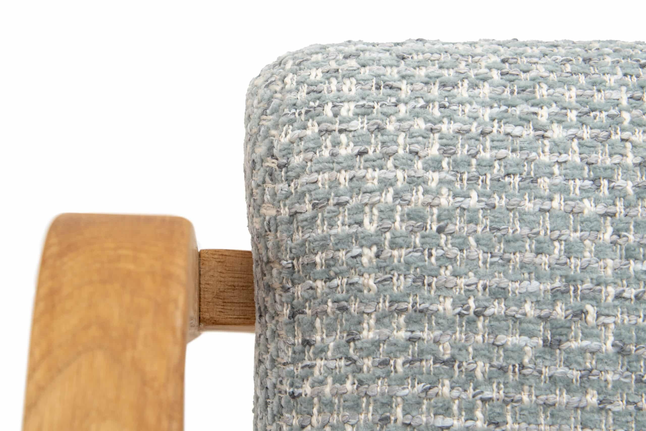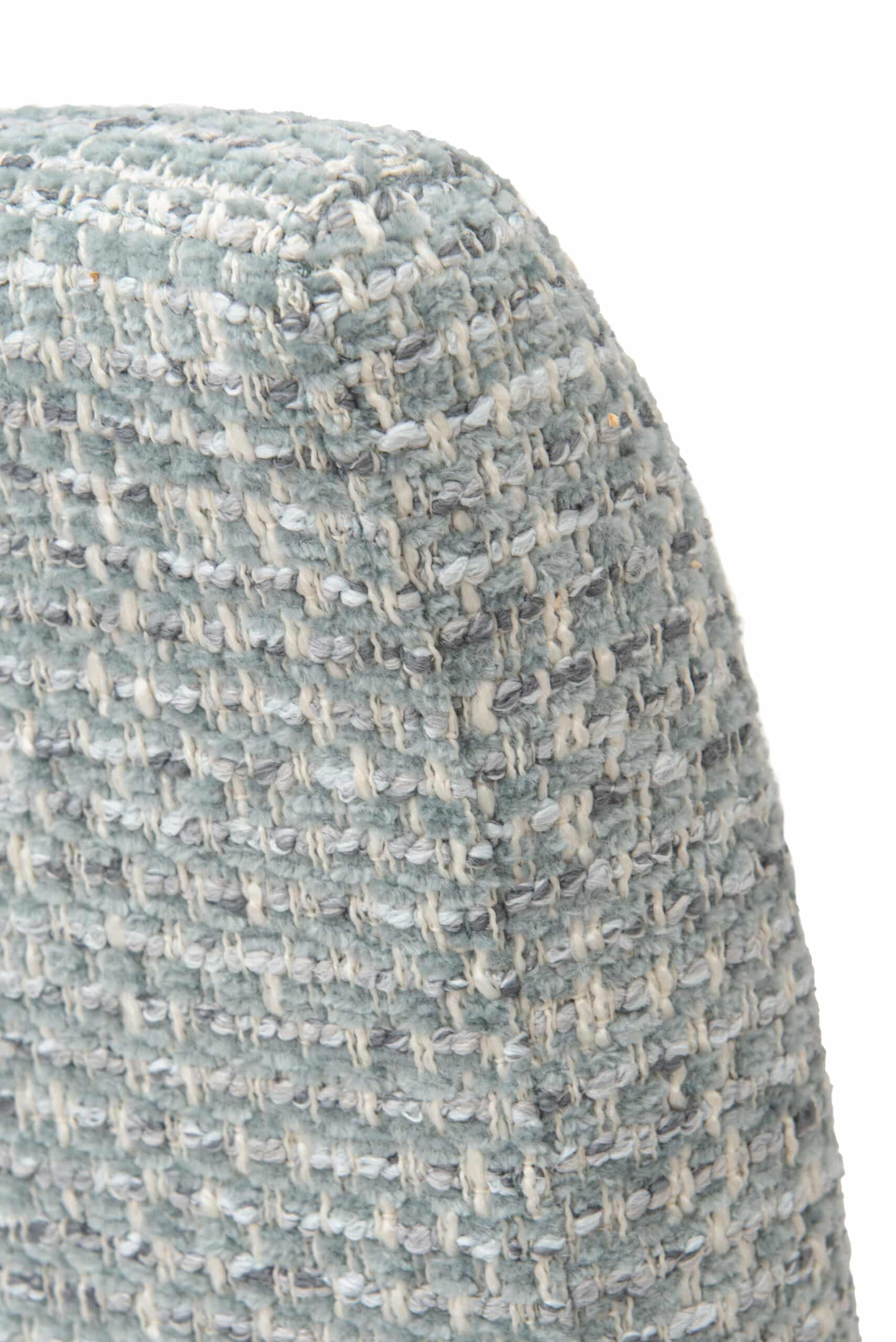 Siedzisko i oparcie są pokryte wysokiej jakości tkaniną w eleganckim jasno niebieskim tonie, który sprawia uspokajające i wyrafinowane wrażenie. Wyrazista tkana struktura nadaje tapicerowaniu głębi i wizualnej atrakcyjności, podczas gdy przyjemna powierzchnia zapewnia komfort podczas siedzenia. Połączenie grubszych i drobniejszych włókien tworzy plastyczną, lekko zapętloną powierzchnię z przyjemnym efektem dotykowym. Kolorystycznie komponuje się w jasno niebieskim odcieniu z delikatnymi tonami szarości i kremu, które wzajemnie się przenikają i nadają materiałowi głębi oraz naturalnego wyglądu. Ergonomicznie ukształtowane oparcie wraz z podłokietnikami zapewniają naturalne wsparcie pleców i ramion, dzięki czemu krzesło jest wygodne nawet podczas dłuższego siedzenia.