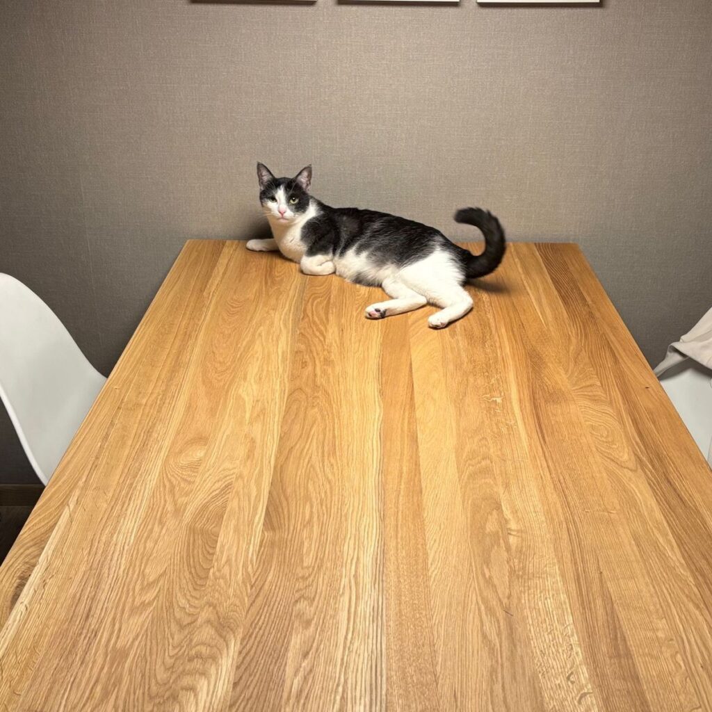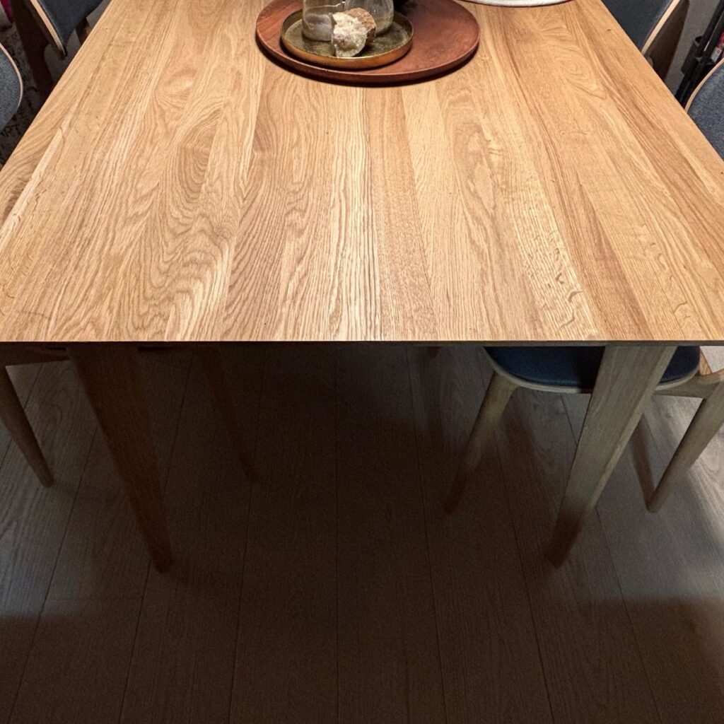 Stół jest piękny, blat mógłby być lepiej zabezpieczony, bo to mebel do codziennego użytku. Widać na nim ślady, które zostają nawet po tłustych rączkach dziecka. Mam w planie go zaolejować, by nie był tak „chłonny” jednak uważam, że przy blacie stołu powinno być to już zrobione tak, by nie chłonął wszystkiego.