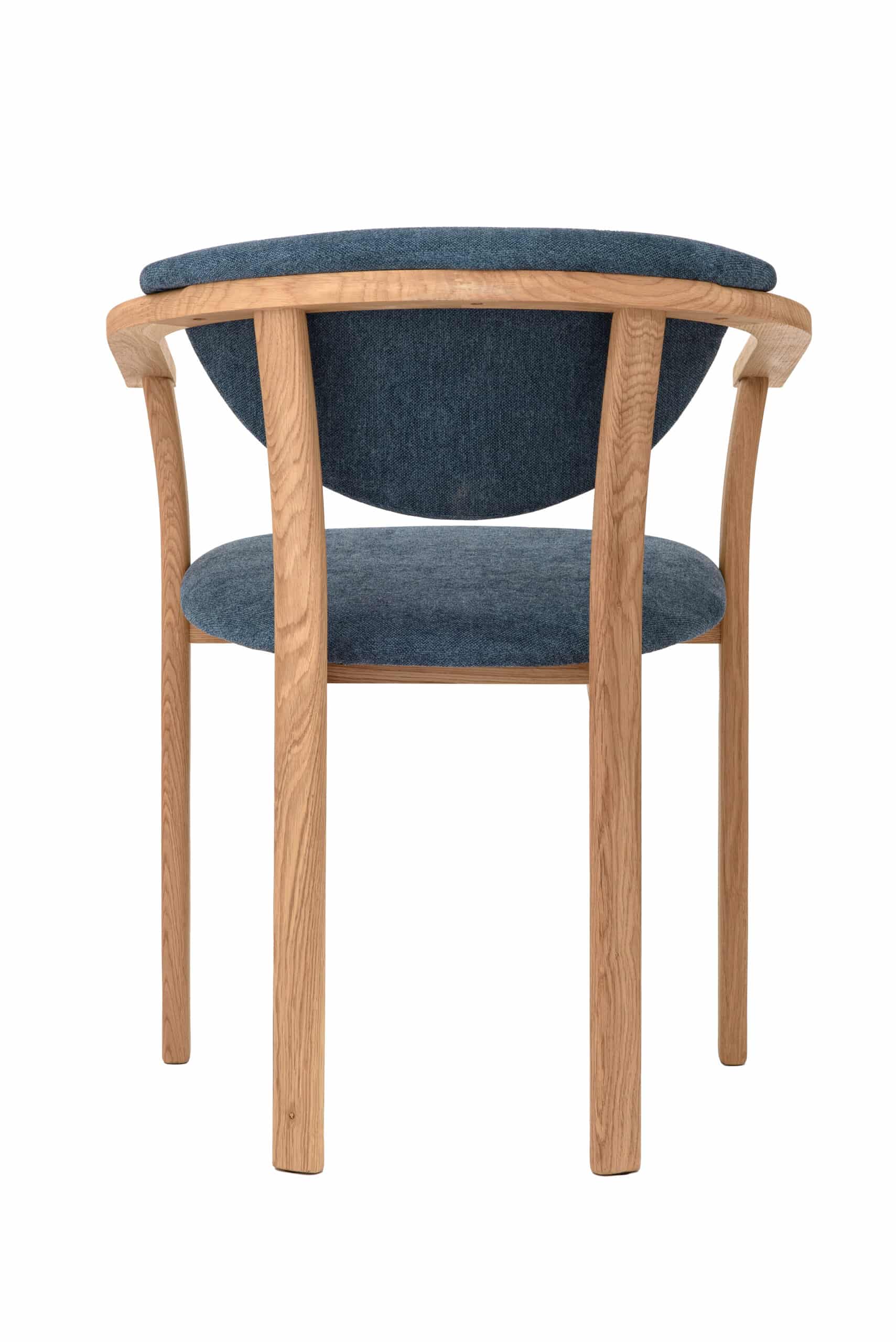 Drewniane krzesło z podłokietnikami Alexis w niebieskim kolorze zachwyca ponadczasowym i lekkim designem. Konstrukcja z litego drewna dębowego wyróżnia się delikatnie zaokrąglonymi liniami i płynnie połączonymi podłokietnikami, które tworzą harmonijną całość. Niebieska tapicerka wnosi do wnętrza świeżość i elegancję, dzięki czemu krzesło z łatwością wkomponuje się w nowoczesne i skandynawskie przestrzenie.