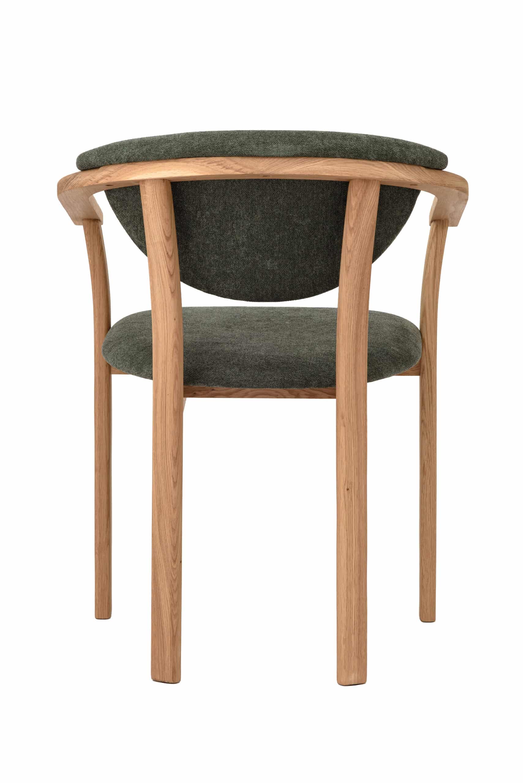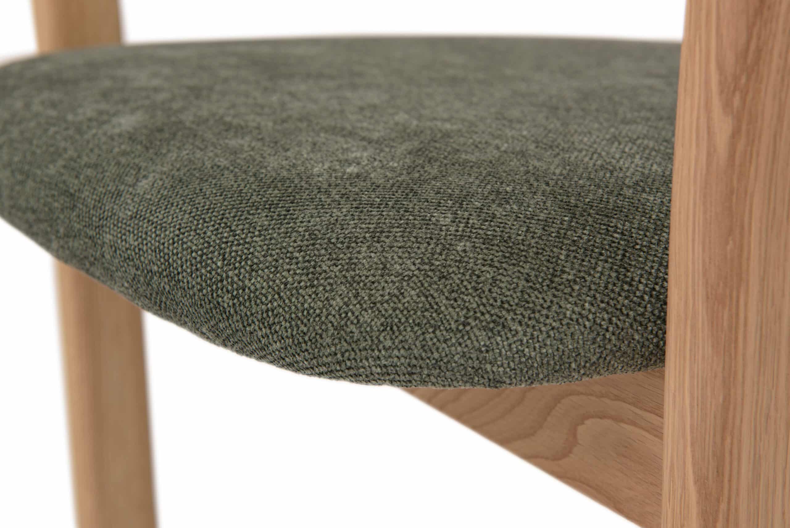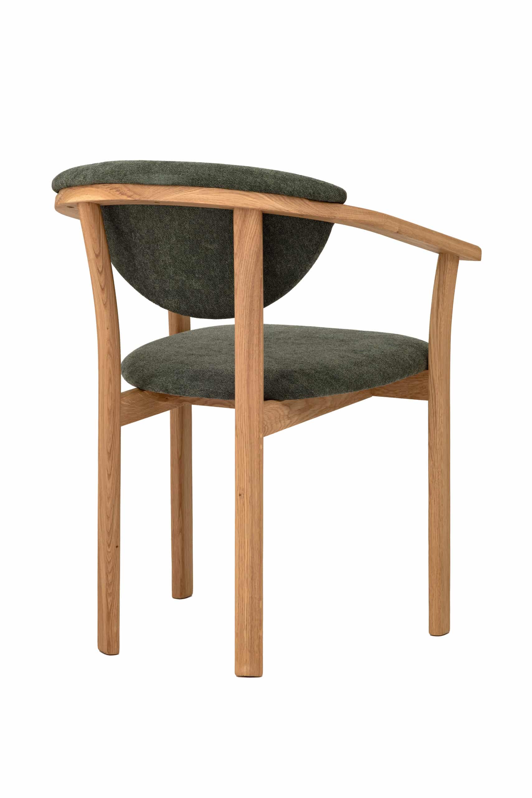 Drewniane krzesło Alexis już na pierwszy rzut oka zachwyca swoim ponadczasowym i lekkim designem. Połączenie litego drewna dębowego i delikatnie zaokrąglonych linii sprawia wrażenie lekkości, a jednocześnie zapewnia stabilność i wytrzymałość. Konstrukcja z płynnie łączącymi się podłokietnikami tworzy harmonijną całość, która podkreśla nowoczesne oraz skandynawskie wnętrza. Zielona tapicerka nadaje krzesłu świeży i naturalny wygląd, który łatwo komponuje się z innymi materiałami i kolorami.