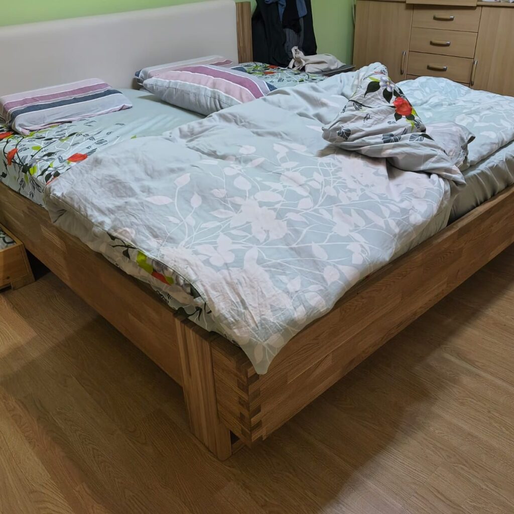 Postel je parádní moc pěkné dřevo. Jedinou vadu na kráse má spojovací materiál. Excentrický nábytkový konektor by si zasloužil kvalitnější materiál.
