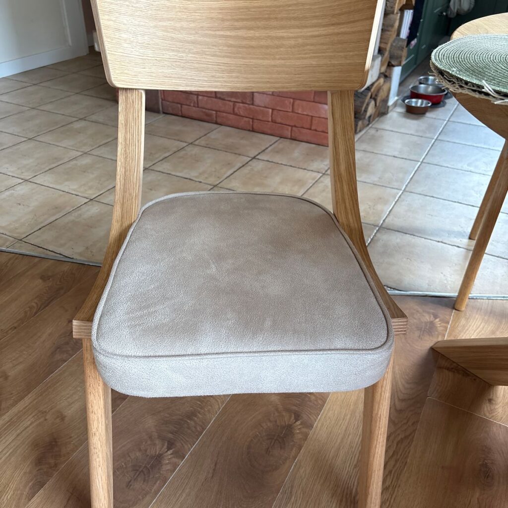 Krzesło do jadalni wykonane jest z wysokiej jakości drewna dębowego, które zostało olejowane, co gwarantuje długą żywotność oraz odporność na zużycie. Dzięki starannie wykonanej obróbce powierzchni, jest ona bardzo łatwa w utrzymaniu i czyszczeniu. Wyściełane siedzisko pokryte jest beżową, trwałą zamszową tkaniną, która nadaje nowoczesny wygląd, zapewniając jednocześnie miękkość i wygodę podczas siedzenia.