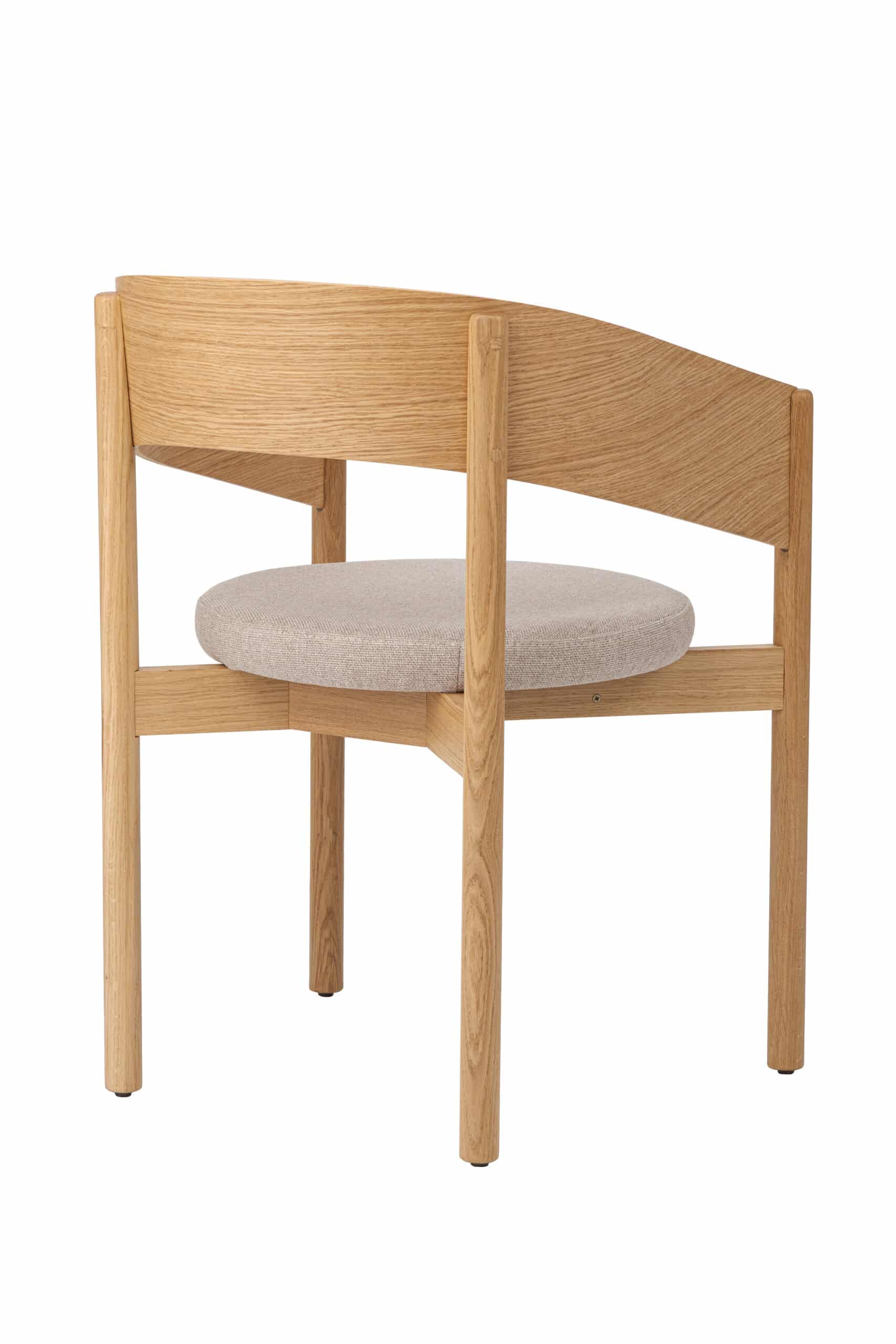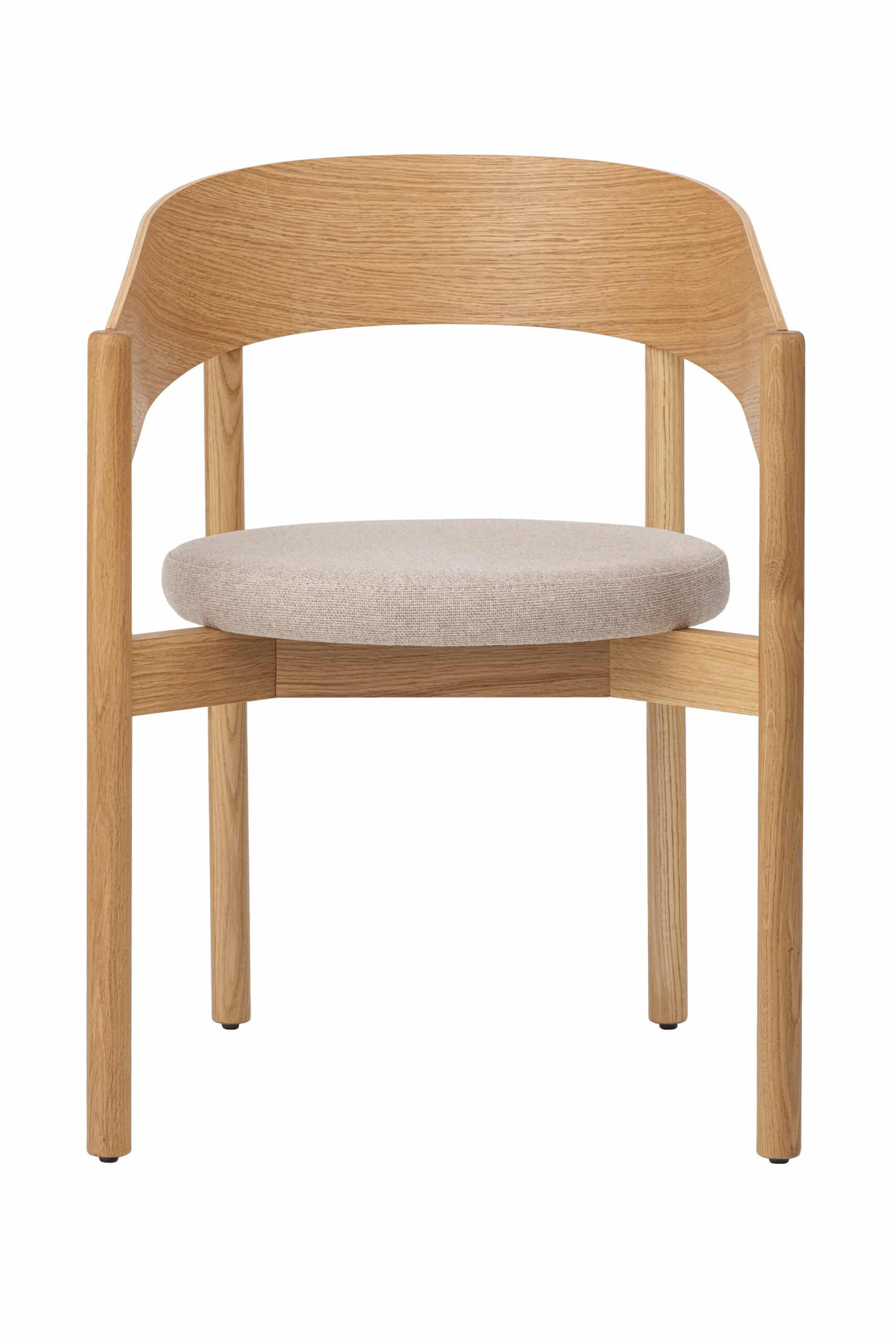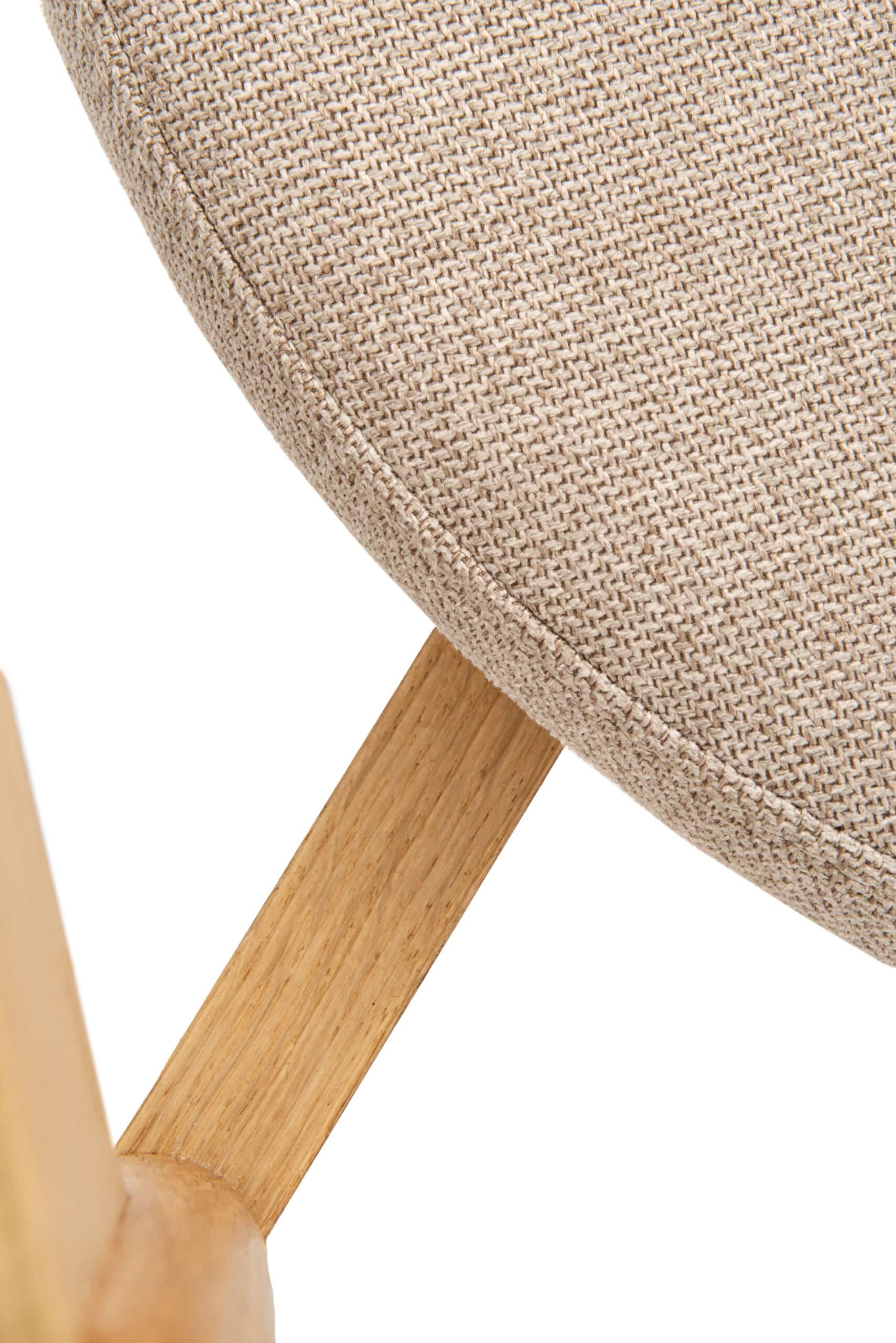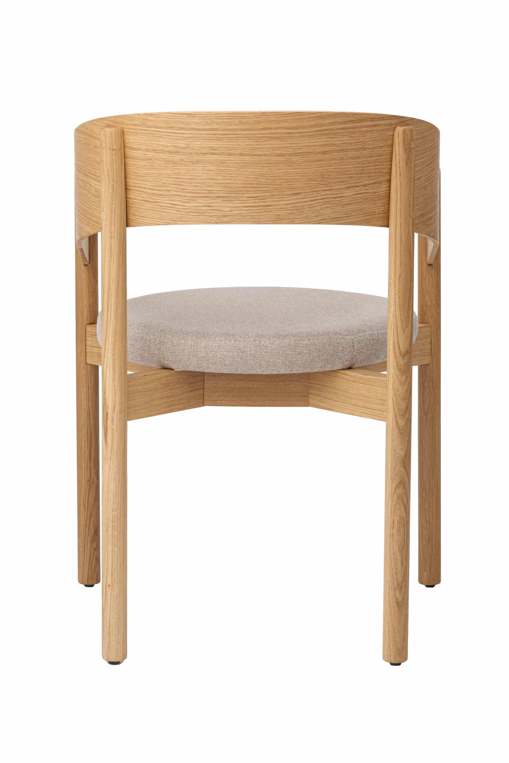 Oparcie z formowanej sklejki dębowej nadaje krzesłu wizualną lekkość i delikatność. Płynnie łączy się z litymi elementami konstrukcji i wraz z beżową tapicerką tworzy zrównoważoną, spokojną całość. Neutralna kolorystyka sprzyja uniwersalnemu zastosowaniu krzesła w różnych typach wnętrz.
