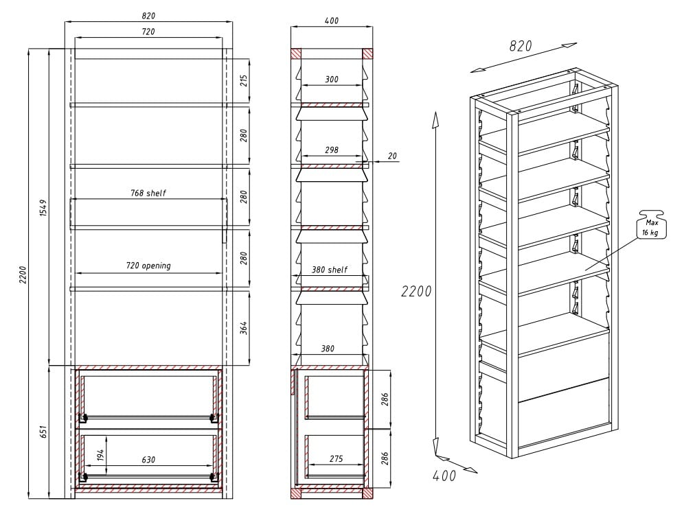 Wymiary 40 × 82 × 220 cm
