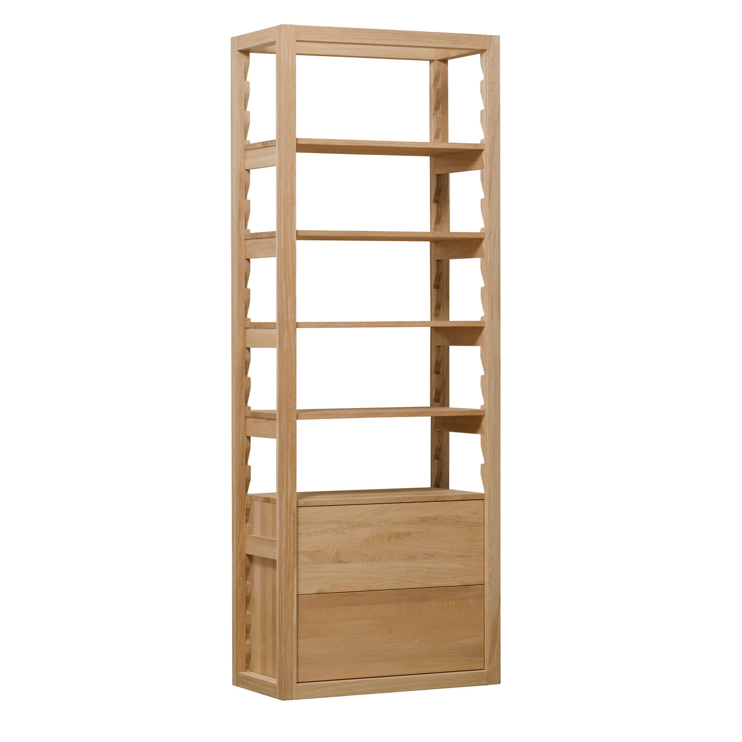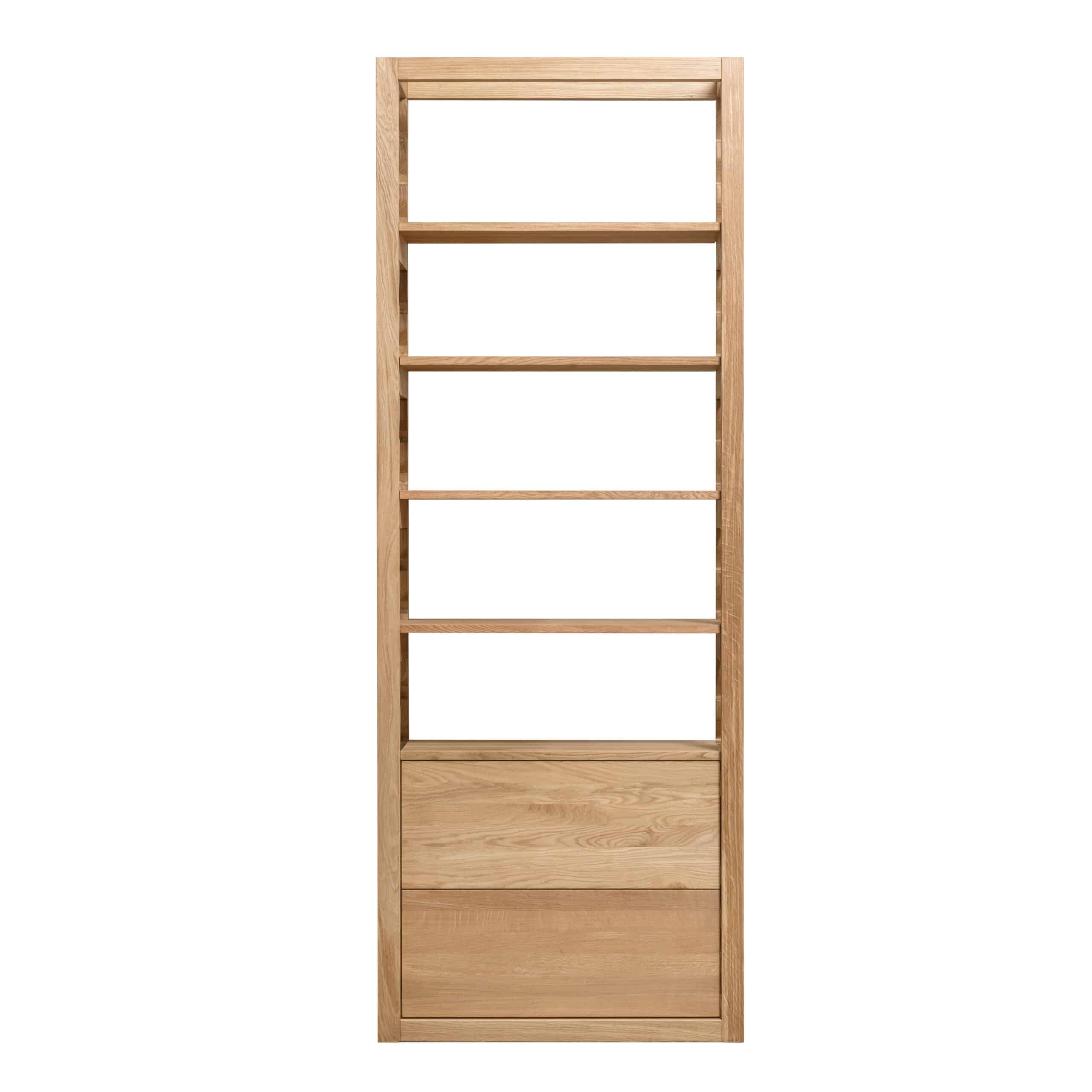 Regał łączy otwartą i zamkniętą przestrzeń do przechowywania, co czyni go praktycznym i estetycznym elementem wnętrza. Górną część stanowi otwarty regał z czterema półkami, idealny do eksponowania książek, dekoracji, roślin lub przedmiotów osobistych. Dolna część oferuje dwie pojemne szuflady, które zapewniają dyskretne miejsce do przechowywania wszystkiego, co chcą Państwo mieć pod ręką, ale nie na widoku.