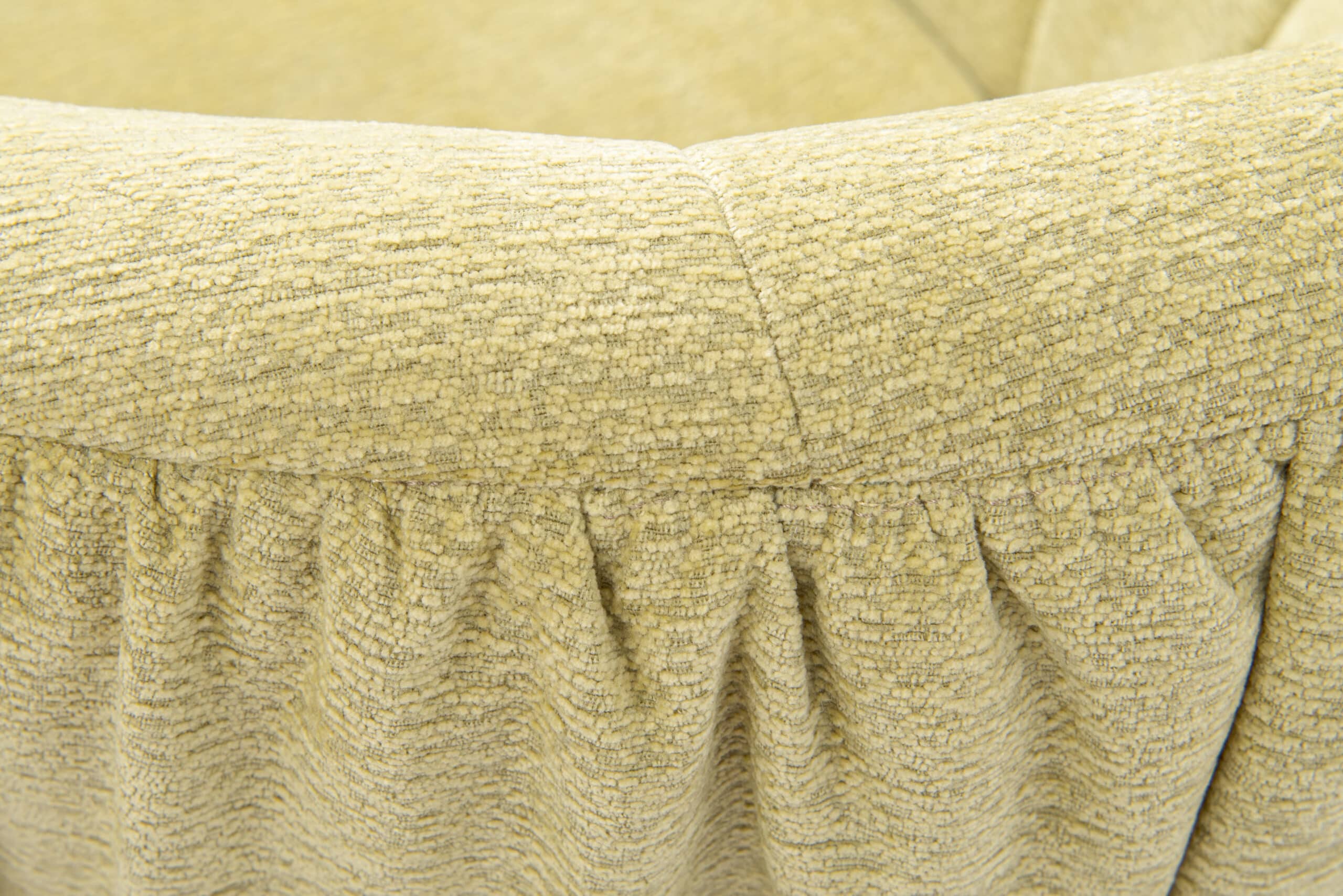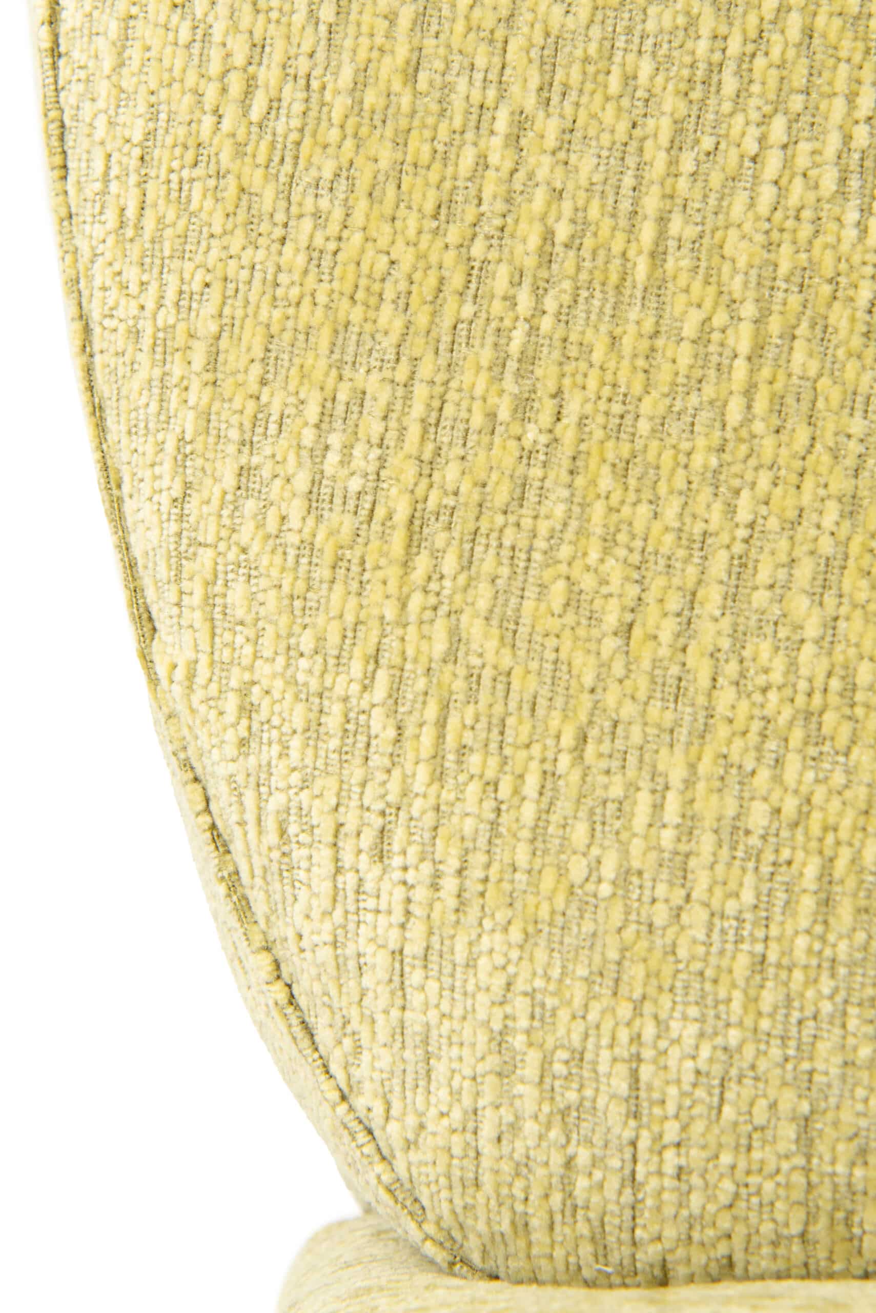 Siedzisko i oparcie są bogato wyściełane i pokryte strukturalną tkaniną w jasno żółtym odcieniu. Tkanina ma delikatnie tkaną powierzchnię, jest przyjemna w dotyku i jednocześnie odporna na codzienne użytkowanie. Oparcie i boki są pionowo przeszywane w regularne segmenty, co tworzy dekoracyjny rytm i jednocześnie optycznie kształtuje fotel. Vonkajšia strana je opatrená bohato riaseným čalúnením, ktoré prináša pocit mäkkosti a jemný nádych retro elegancie.