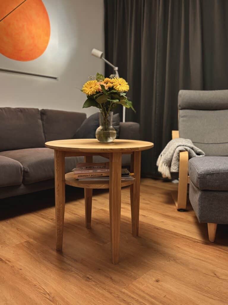 Drewno dębowe jest synonimem jakości, trwałości i elegancji. Ten stolik boczny wykonany jest z prawdziwego litego dębu, który szczyci się nie tylko wytrzymałością, ale także piękną terxturą i naturalnymi odcieniami. Każdy element jest oryginalny – letnie pierścienie i naturalne wzory nadają stolikowi niepowtarzalny urok.