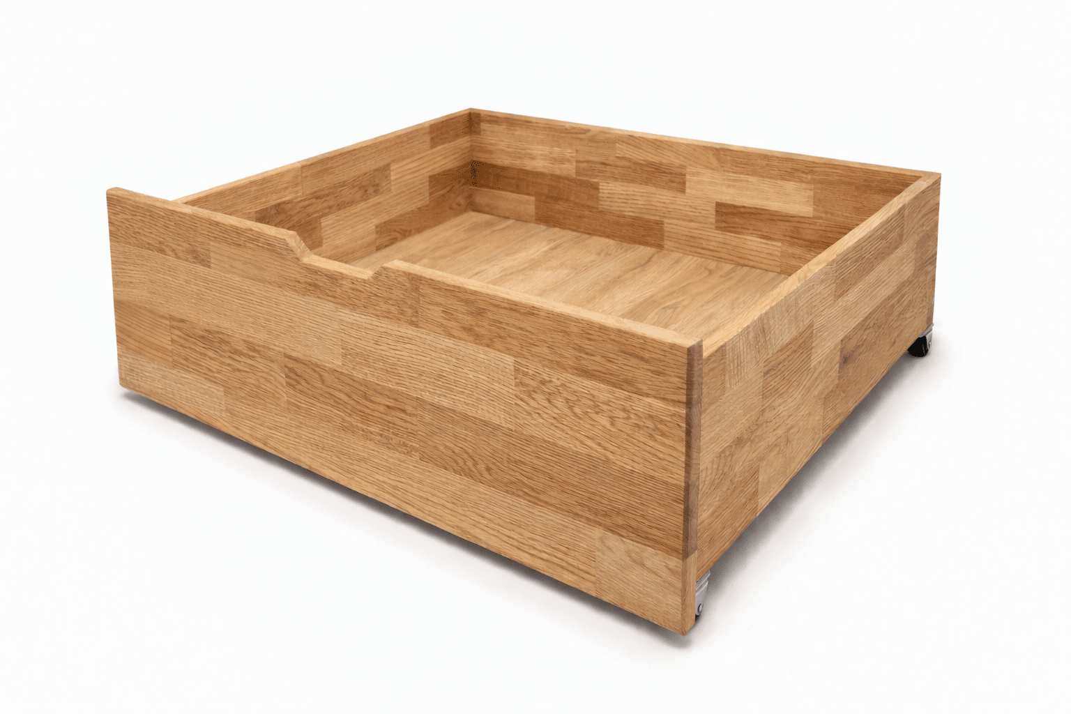 Elegancki detal, który ma sens. Szuflada z litego dębu zapewnia porządek i ponadczasowy design. Wykorzystajcie Państwo w pełni przestrzeń pod łóżkiem.